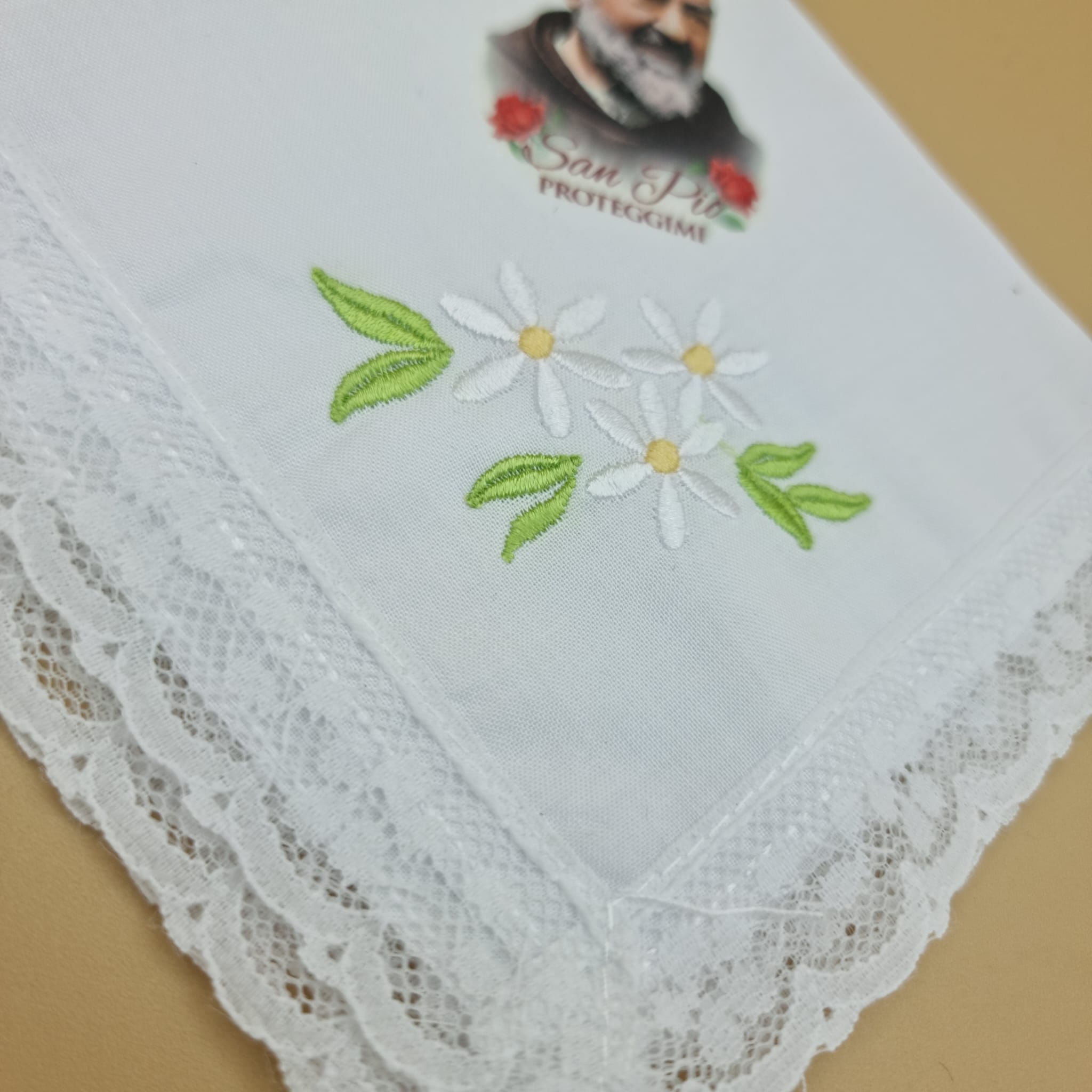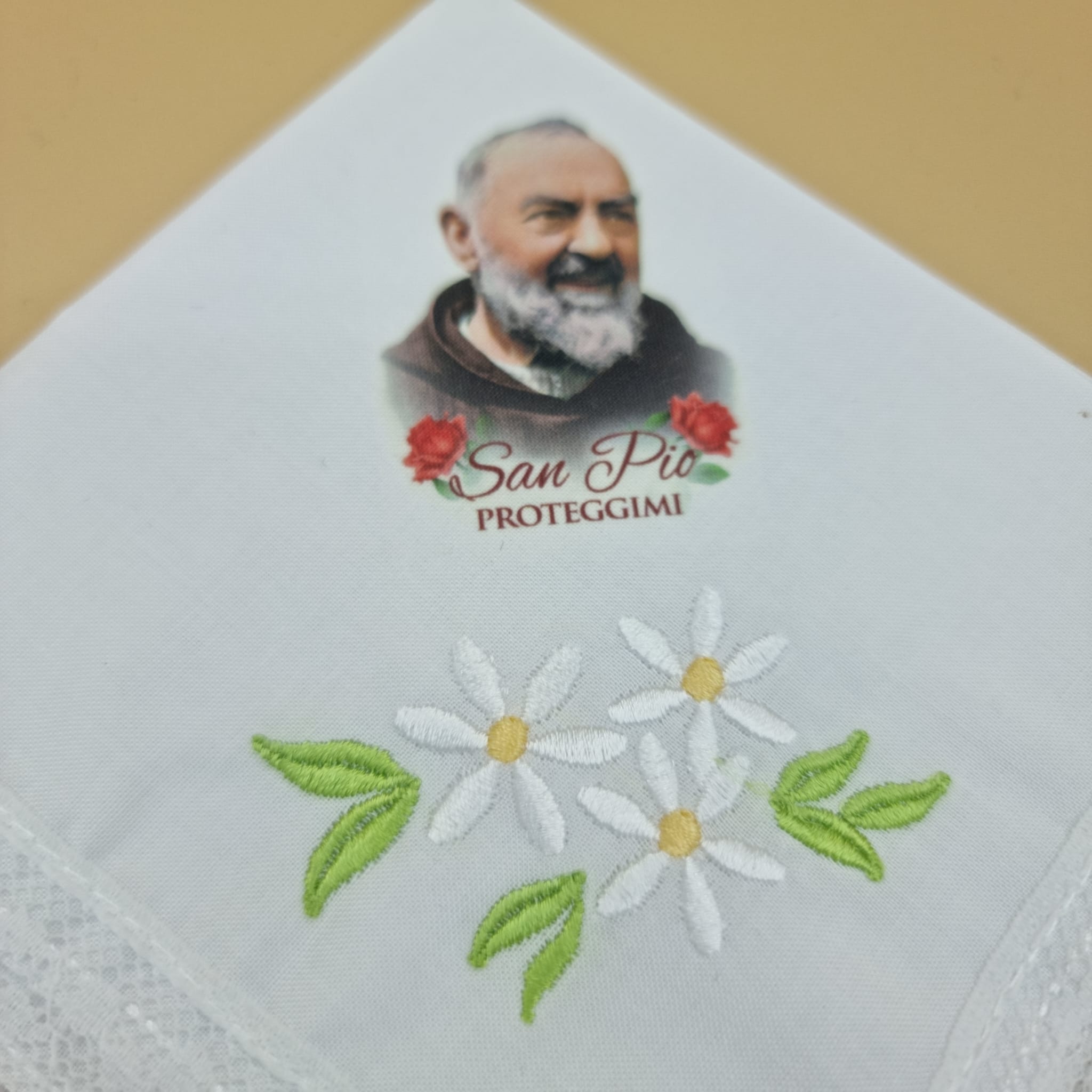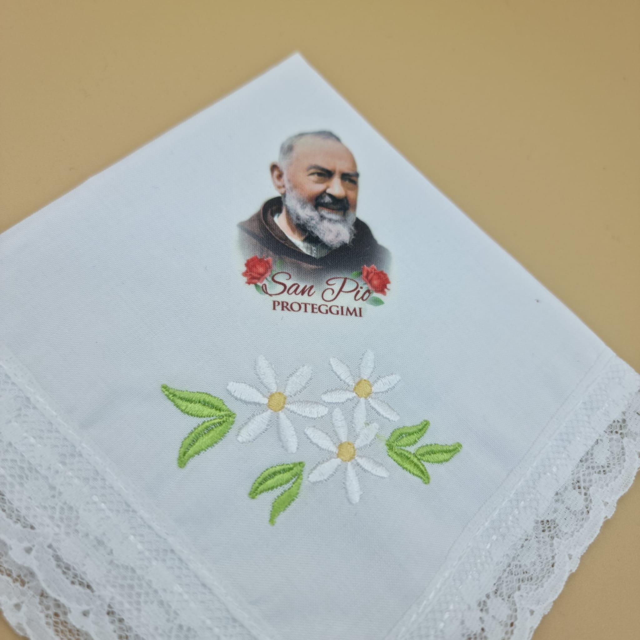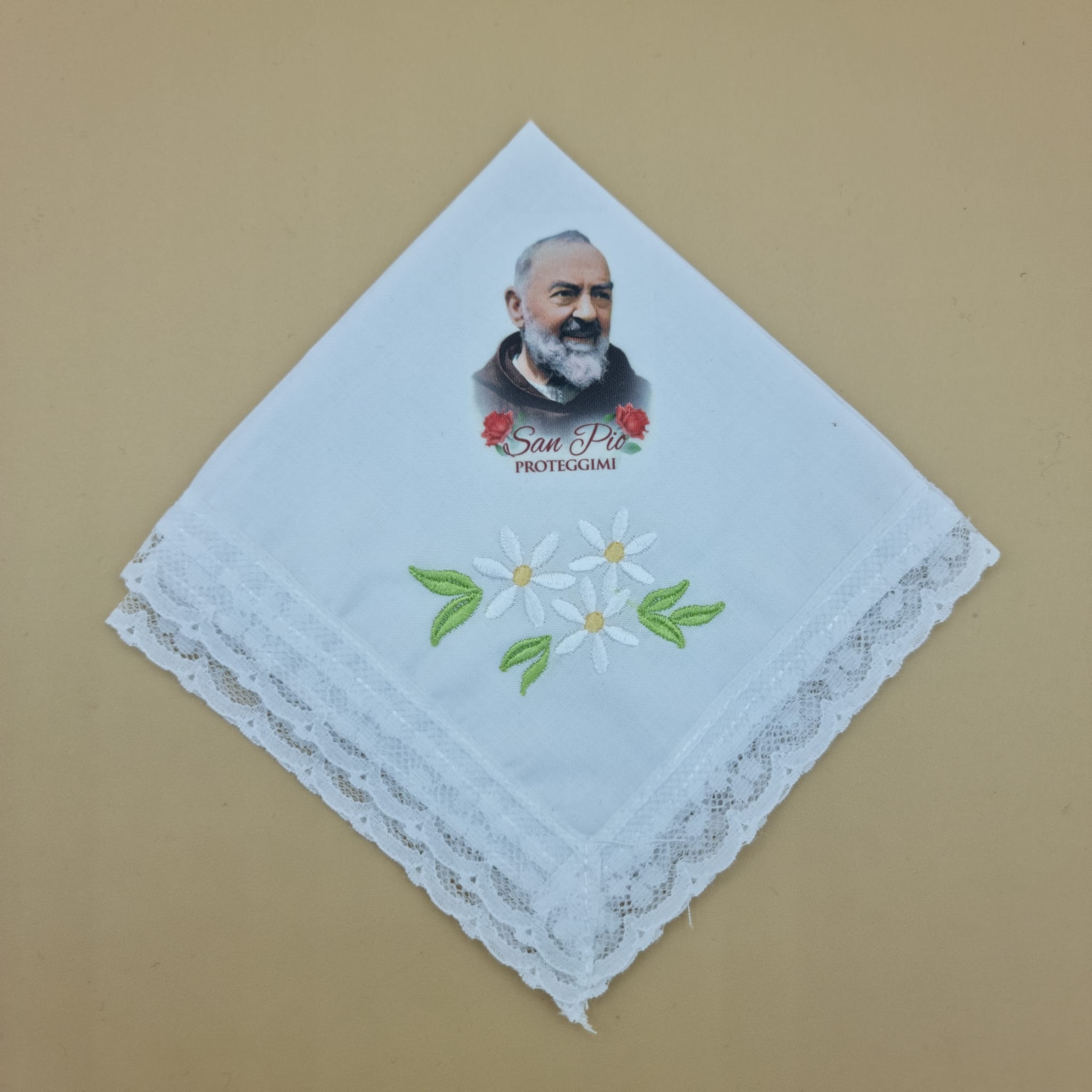 Fazzoletto realizzato in cotone, impreziosito da dei fiori e una stampa fotografica di Padre Pio.